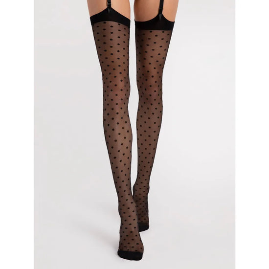Les Louise 20 den, de la maison Fiore, sont des bas autofixants semi‑transparents élégants décorés d’un motif de pois classiques. Riches en style rétro, ils allient délicatesse et audace pour un rendu sophistiqué et féminin.