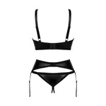Bold, magnetic, sculptural. The three-piece Armares set by Obsessive embodies bold, unabashed seduction. With its open bra, structuring garter belt, and matching open thong, it creates a deliberately provocative yet controlled silhouette. Lingerie that hides nothing, yet reveals everything—assurance, desire, and confidence.