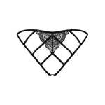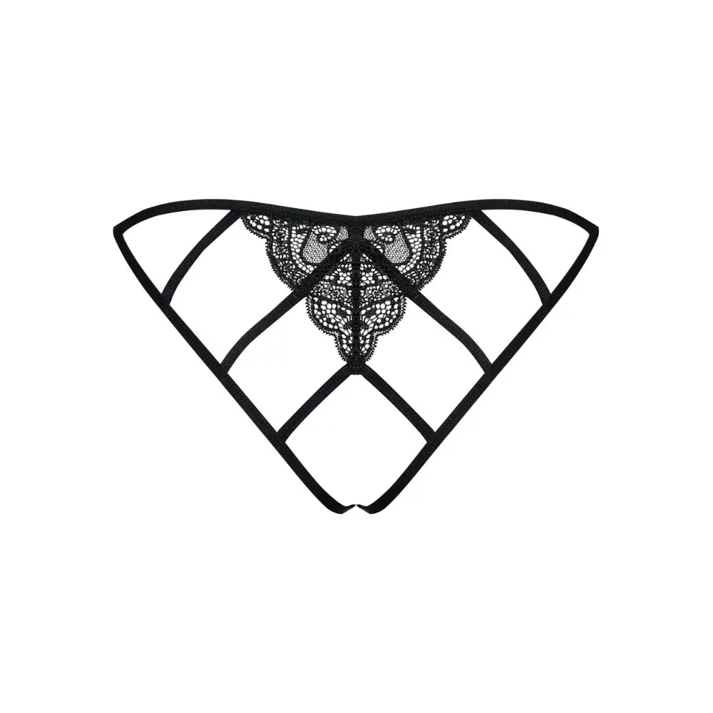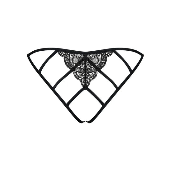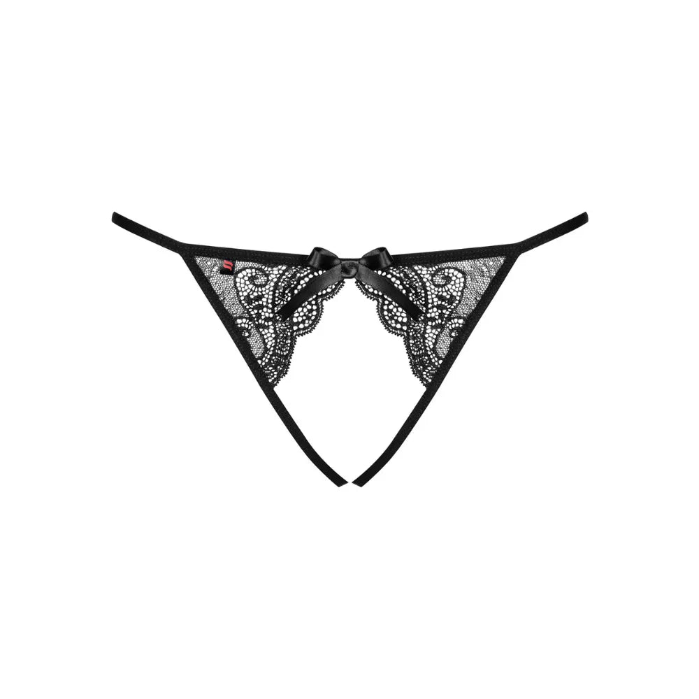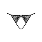 The "Miamor" are very sensual thong panties by Obsessive. Made from openwork floral lace, they reveal the crotch for a provocative yet elegant look, embellished with a small satin bow at the front for a feminine touch.