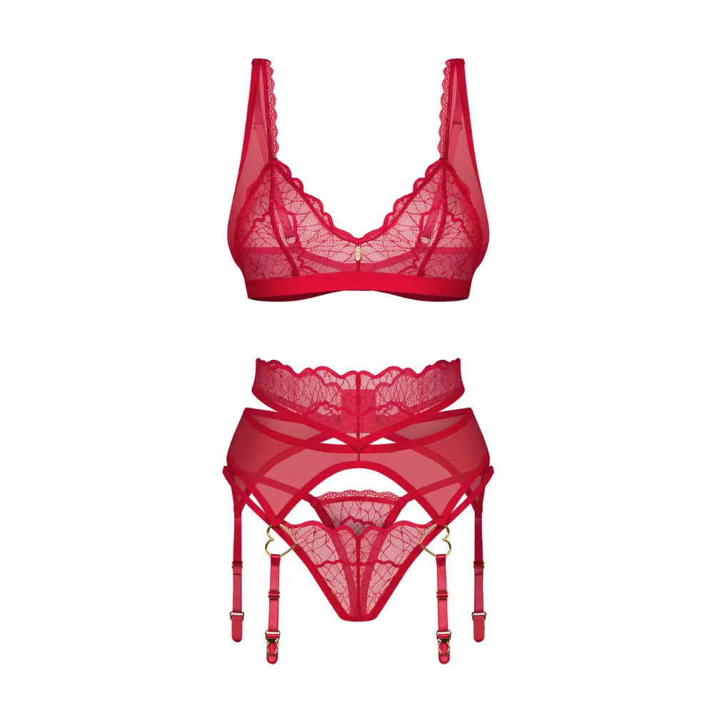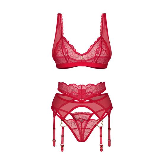 L'ensemble trois‑pièces en rouge séduction "Cupide Désir" est parfait pour créer une ambiance intime. Il se compose d’un bralette délicat, d’un porte‑jarretelles intégré et d’un string coordonné. Conçu en Europe, il mêle transparence, broderies fines et touches dorées, pour allier féminité et élégance.